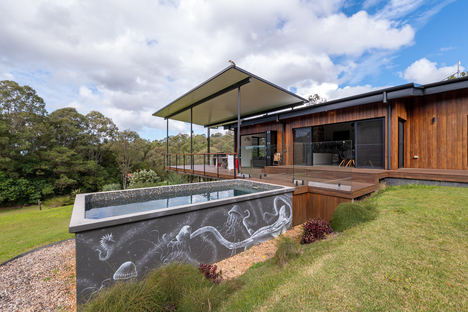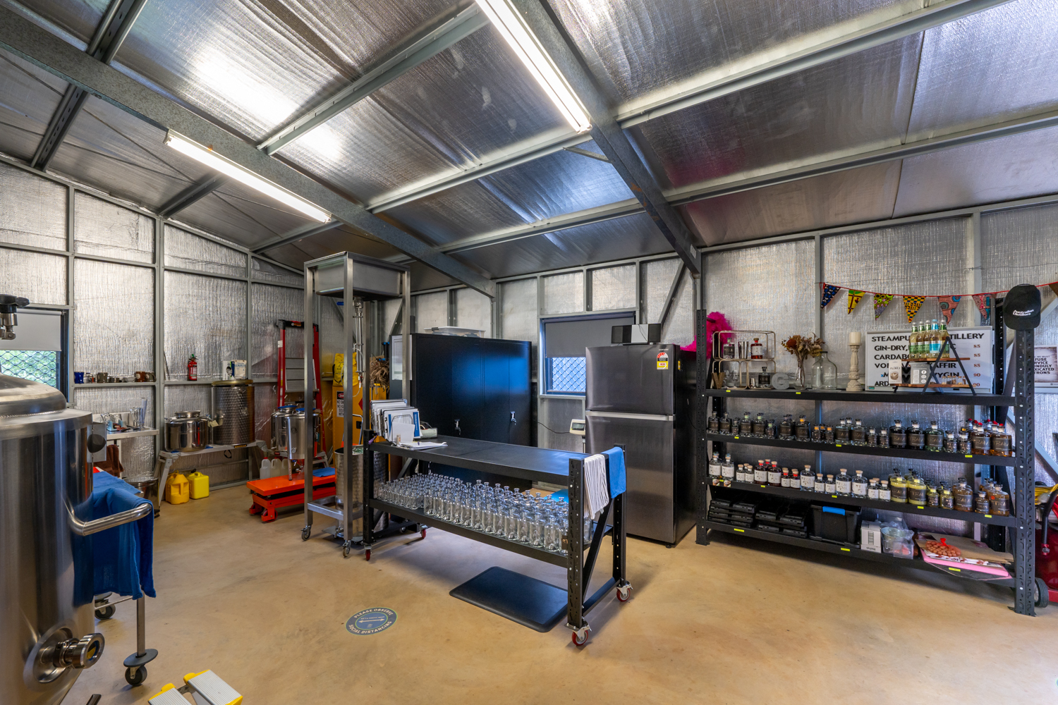 The celebrated mural artist EJ Zyla has beautifully painted the sides of the inviting plunge pool, which overlooks the extensive lawns where the kids and pets can frolic with tree lined boundaries and endless views beyond. Currently fenced for cattle and 'Land for Wildlife' accredited, the land gently undulates with a spring-fed dam, an established orchard of fruit trees and would be ideal for any livestock, permaculture or as a horse property. Additionally, the insulated 5.6m x 10.9m shed has been specifically built to house a small batch distillery with a private tasting room but is ideal for vehicles or for a caravan and has water and 3 phase power to it.