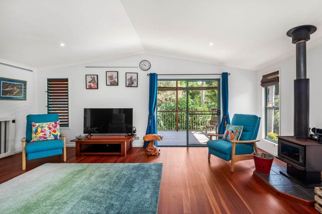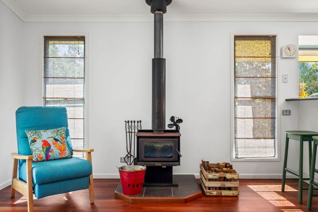 • Living Areas: Open-plan living area featuring vaulted ceilings, hardwood flooring, timber shutters, and a combustion wood fire, creating a warm and inviting atmosphere.
