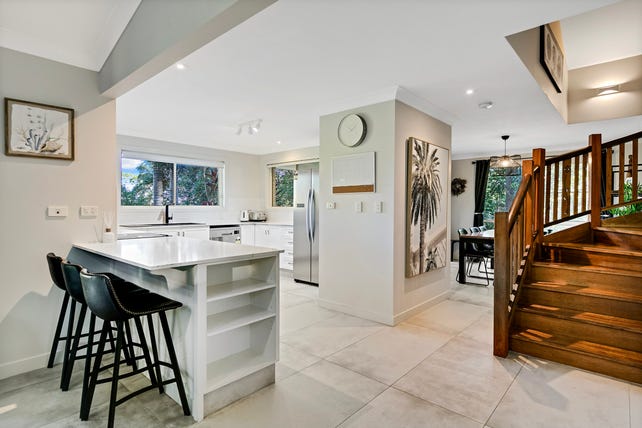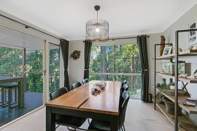 Split over three levels, entering upstairs through the front door you'll note the wide hallway and polished hardwood timber floors. On this level is the master bedroom, bedroom 2 and 3 and huge main bathroom with dual access and separate toilet. All bedrooms provide outdoor access to their own decks which is great for growing families in terms of separation of space for teenager hangs as well as beautiful airflow and year-round ventilation. Head down a few stairs to the mezzanine level to the fourth bedroom or guest retreat with it's own bathroom and yes again lush bushland views. Your internal access to the home is at this level through the double lock up garage which houses the laundry area also. Heading down the solid timber staircase to the heart of the home you'll be wowed by raked high ceilings, an entertainers kitchen, separate dining room and large living space.