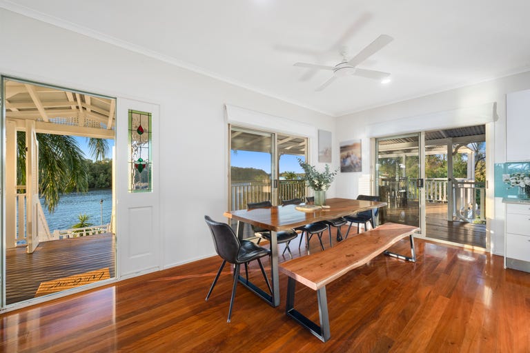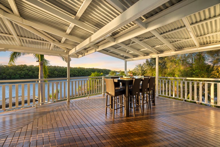 Set across two expansive levels, this modern Queenslander blends timeless charm with thoughtful design to maximise its rare north-facing absolute river frontage. Wraparound verandahs and oversized glass sliders invite the outdoors in, showcasing panoramic views across the water and into the mangroves beyond.