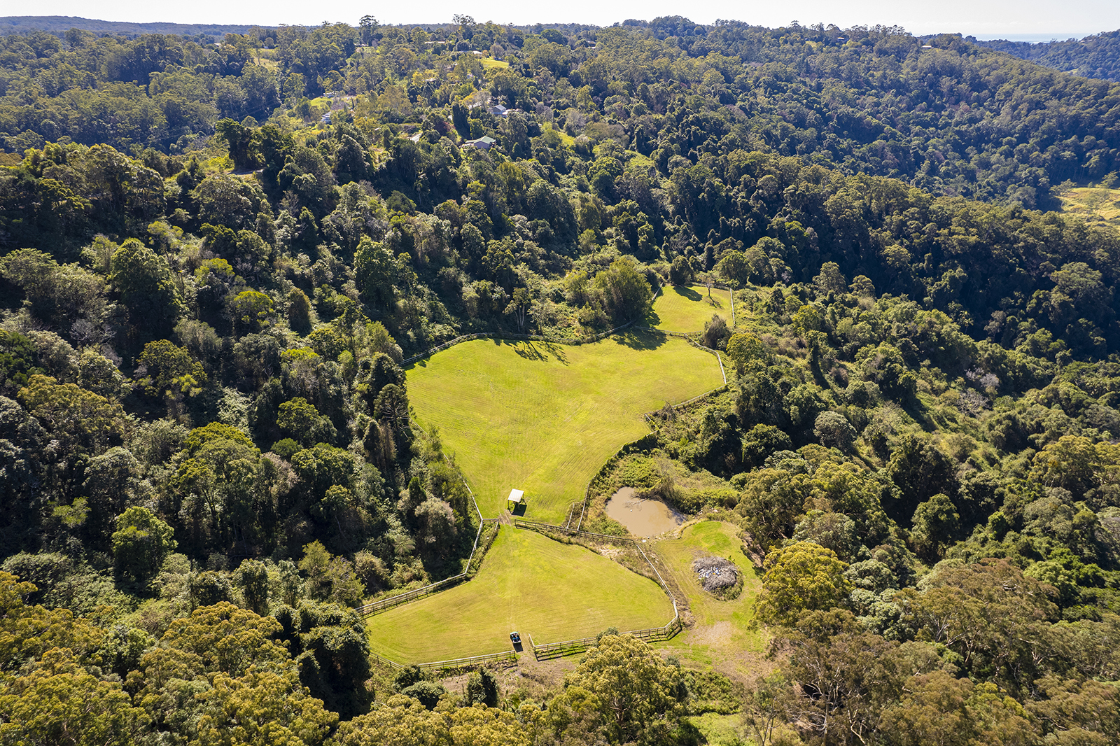 A discreet street entrance leads to this secluded property, revealing three separate titles under rural zoning. The unique segmentation offers vast open grazing fields, a verdant rainforest showcasing a variety of citrus, exotic and tropical fruit trees, and stepped dams overlooked by picturesque gazebo viewing decks.